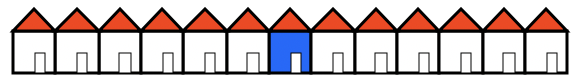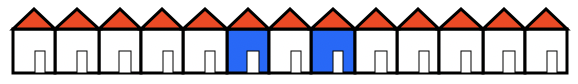 Diese Straße ist ein einfaches Beispiel eines zellulären Automaten. Der Automat hat eine Menge von Zellen und eine Übergangsfunktion, die jeder Zelle (hier: die einzelnen Häuser) einen neuen Zustand (hier: weiß oder blau) in Abhängigkeit einer Umgebung (hier: die Zelle selbst und ihre beiden Nachbarn) zuordnet.